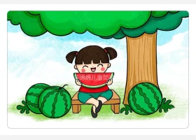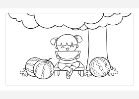 关于人物、夏天的简笔画,美好的夏天,夏天在大树下吃西瓜的小女孩简笔画。